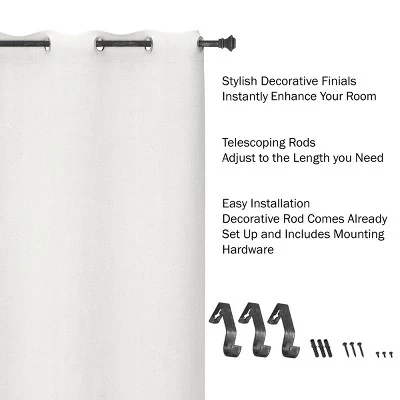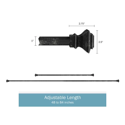 - PRODUCT DETAILS- Material: Steel, Dimensions: Rod Measurement: Extends 48-84-in, 1-in Diameter, Finial Measurement: (L) 2.75-in x (W) 2.5-in, Includes: (3) 4-in Wall Mounting Brackets, Screws and Anchors, Color: Antique Black Finish