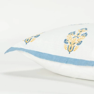 This pillow is framed with an inch light blue stitched flange. The ivory cotton slub is printed with botanical motifs in yellow. Blue accent machine embroidery embellish these motifss for a delicate vintage vibe. The back is a lighter weight solid coordianting cotton with a hidden zipper closure for ease of fill.