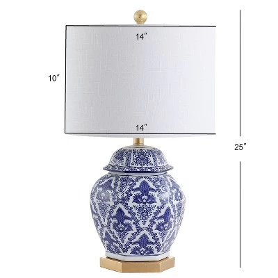 - A classic Chinese-inspired ginger jar shape looks current and cool in a blue and white damask and brass base