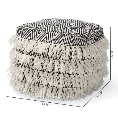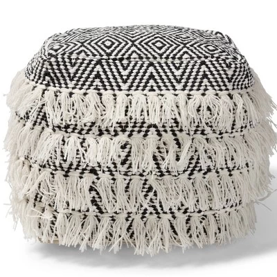 Add a cozy, bohemian touch to any space with the Alain pouf. Handwoven from cotton and wool, the Alain features a striking black and ivory diamond pattern. Rows of tassels along the sides lend a playful feel. This versatile piece can be used as a seat, footstool, or casual coffee table. Made in India.