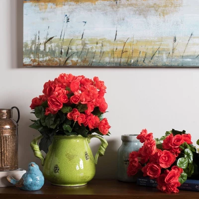 This Vickerman artificial orange begonia bush is the perfect addition to any arrangement. This bush features 102 orange begonia blossoms and 90 green leaves on a wired stem. It measures 15.25 inches tall.
