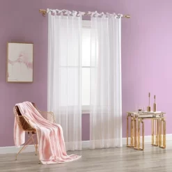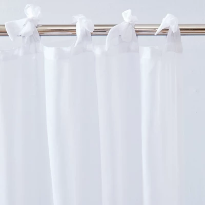 Betsey Johnson’s white sheer window panels are made of 100% polyester. Each set includes 2 panels featuring top décorative ties that are designed to visibly display on the window rod.