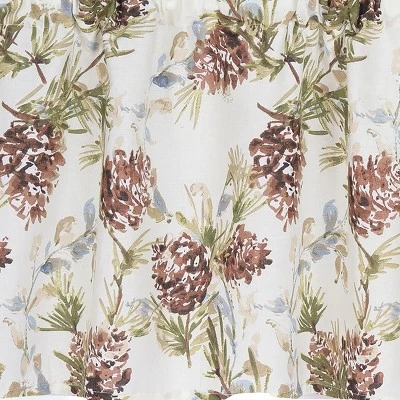 Add a touch of woodland elegance and rustic outdoor appeal to your home with the Cooper Pines ruffled valance. A large-scale print of evergreen branches and pinecones with touches of beige and blue on a soft white background makes this ruffled valance perfect for any nature enthusiast. Hang this valance in your breakfast nook, cozy den or bedroom, creating an inviting scene. This ruffled unlined valance is light filtering with a 2-inch rod pocket and a 1-inch decorative header. Crafted of cotton, machine wash and tumble dry low for easy care. Love this pattern? Cooper Pines is also available in our bedding and tabletop collections. Set includes 2 valances, each valance is 72″ wide, hanging rod not included.
