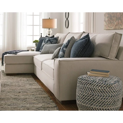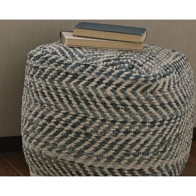 This darling pouf is queen of the blue jeans. Woven from strips of denim, the square shape will be a favorite go-to seat or ottoman. It’s also sturdy enough to hold a serving tray. Hand woven chevron design in shades of blue. Recycled denim and cotton chenille cover with polystyrene bead filling. Zipper closure. Spot clean only. Signature Design by Ashley is a registered trademark of Ashley Furniture Industries, Inc.