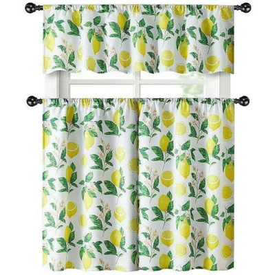 A Complete 3-Piece Café Style Kitchen Curtain Tier & Valance Set For The Home. Features fully hemmed edges and rod pocket headers. These window treatments are ready to use right out of the package. Made of an exquisitite durable polyester woven fabric. No detail was spared in the design of these window treatments.