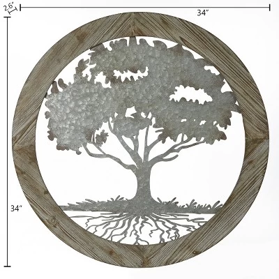 LuxenHome Metal Tree Of Life With Roots Wall Decor With Round Wood Frame