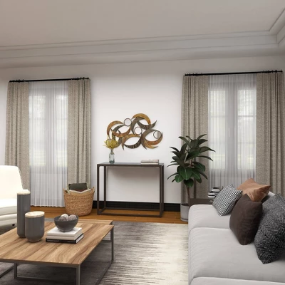 Our product can provide a great first impression on your contemporary style living rooms when displayed on light toned walls. This item ships in 1 carton. Designed with overlapping crescent moon bands with four round silver mirror accents. Can be hung horizontally or vertically using the keyholes on the back; nails and screws not included. Suitable for indoor use only. This item ships fully assembled in one piece. This is a single beige colored wall sculptures. Contemporary style.