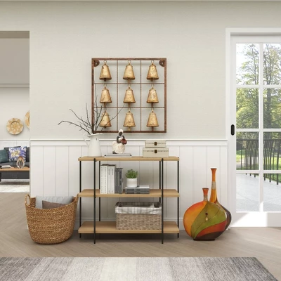 Our eclectic style inspired design metal bell wall plaque will make a great addition to your eclectic home when displayed on the walls of your living room. This item ships in 1 carton. Iron wall decor makes a great gift for any occasion. Can be hung vertically using the keyholes on the back; nails and screws not included. Suitable for indoor use only. This item ships fully assembled in one piece. Made in India. This is a single brass colored wall sculptures. Eclectic style.