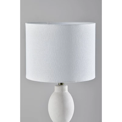 Upgrade your space with the transitional, monochrome aesthetic of the Naomi table lamp. Its white speckled ceramic base adds rich texturing, while the unique round geometric silhouette pulls attention. Topping the lamp is a white fabric drum shade that warmly diffuses light from a 100W bulb while highlighting the subtle texturing of the fabric. The lamp is easily turned on and off by a rotary socket switch. The Naomi table lamp is also available with a beige speckled ceramic base and beige textured fabric shade.