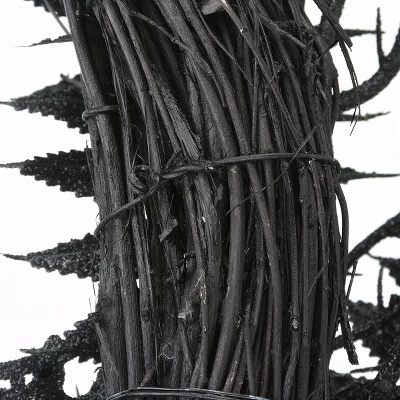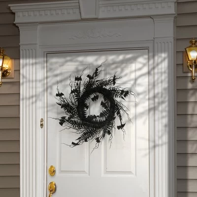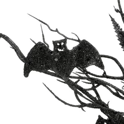 This Halloween wreath features a swirl of assorted matte black fern fronds spinning from a woven branch ring. Slender spindly twig branches also rotate out from the wreath center with small black bats perched at the top of many of them. Hang this unique and creepy wreath on doors, walls and windows in indoor or covered outdoor locations.