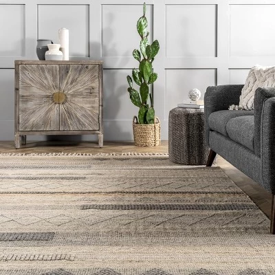 This soft neutral color palette embodies an abstract geometric pattern that is just right for contemporary décor. Hand woven in India from wool, cotton, and jute this rug will add warmth to any space. A rug pad is recommended to prevent slipping and to keep the rug lying flat in one place.