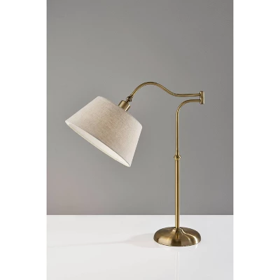 With a touch of urban edge, the Rodeo table lamp modernizes the traditional bridge lamp, giving it an adjustable swing arm in addition to a curved silhouette. The swing arm rotates horizontally, while the shade can be adjusted vertically and secured with a locking key joint, allowing you to direct the light wherever it’s needed. A textured cream colored drum shade brightens the design, softly distilling the light from a 60W bulb, while the antique brass finish adds mid-century modern flair. Complete your dĆ©cor with the coordinating Rodeo floor lamp.