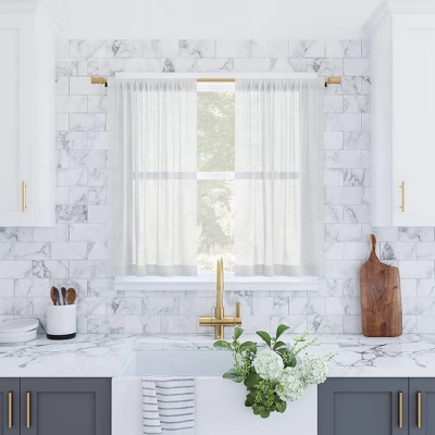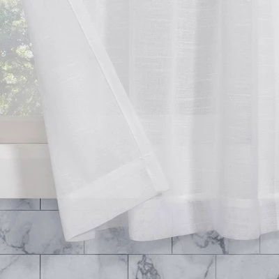 The Slub Textured Linen Blend Cafe Curtain Pair from Archaeo adds textural dimension and cozy style to your kitchen or other small window. The airy weave linen blend fabric with a slub texture gently filters light while enhancing privacy. Rod pocket allows for simple slide-through installation on curtain rods up to 1 ½” in diameter. Sold as a set of two tiers. Coordinating valances or swag pairs are sold separately. Measure carefully before selecting your desired size. Rod not included. Machine wash cold on gentle cycle. Use non-chlorine bleach when needed. Tumble dry on low heat.