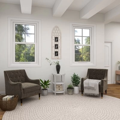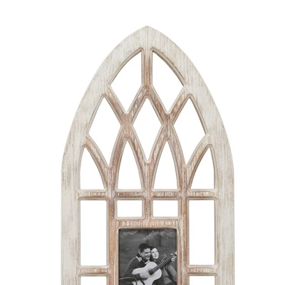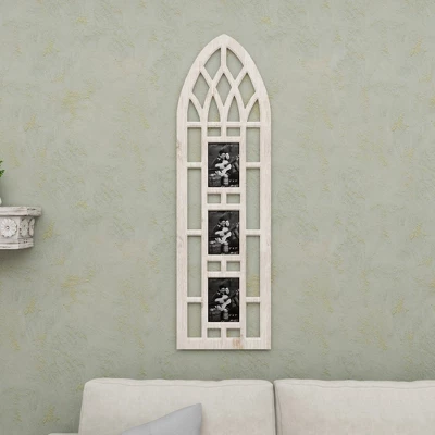 - This whitewashed cathedral inspired wall photo frame features a pointed arch pattern with frames in place of tinted glass