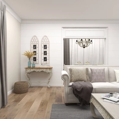 - Light beige wood with a whitewashed finish over the cathedral window-shaped frame