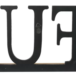 - The letters have a black finish, and they rest on a natural brown platform The color palette complements a farmhouse-style aesthetic