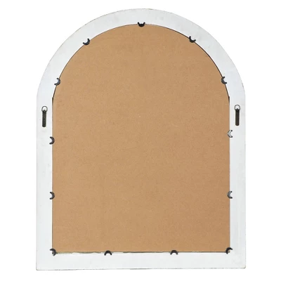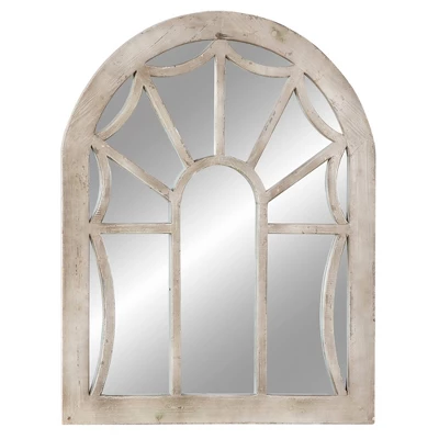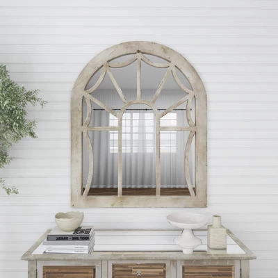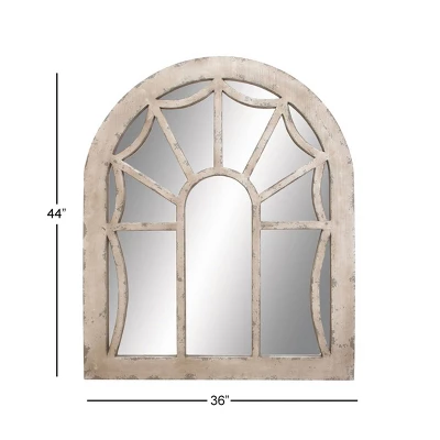 Add antiquated charm to your space with this large cathedral window mirror, featuring a distressed natural beige fir wood frame. The arched silhouette of this large wall mirror creates a cathedral window look with reflective mirror glass panels beautifully reflecting light. The distressing and neutral tone add both vintage and farmhouse style to this decorative mirror, while adding neutral versatile hues to complement any color palette or pattern. Easy and ready to vertically hang by hardware in back. Suitable for indoor use only. This item comes shipped in one carton.